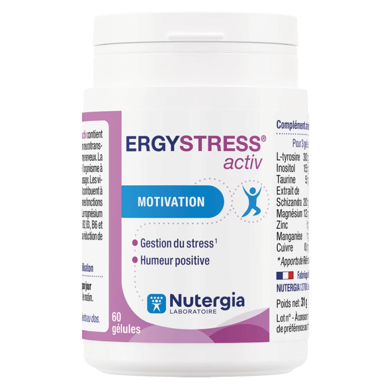 ERGYSTRESS Activ associe de la L-tyrosine à du schizandra, qui aide l’organisme à faire face au stress passager et contribue à la résistance physique et mentale. La formule contient aussi des vitamines B2, B3, B6, B9 et C et du magnésium qui contribuent à des fonctions psychologiques normales et participent à réduire la fatigue.