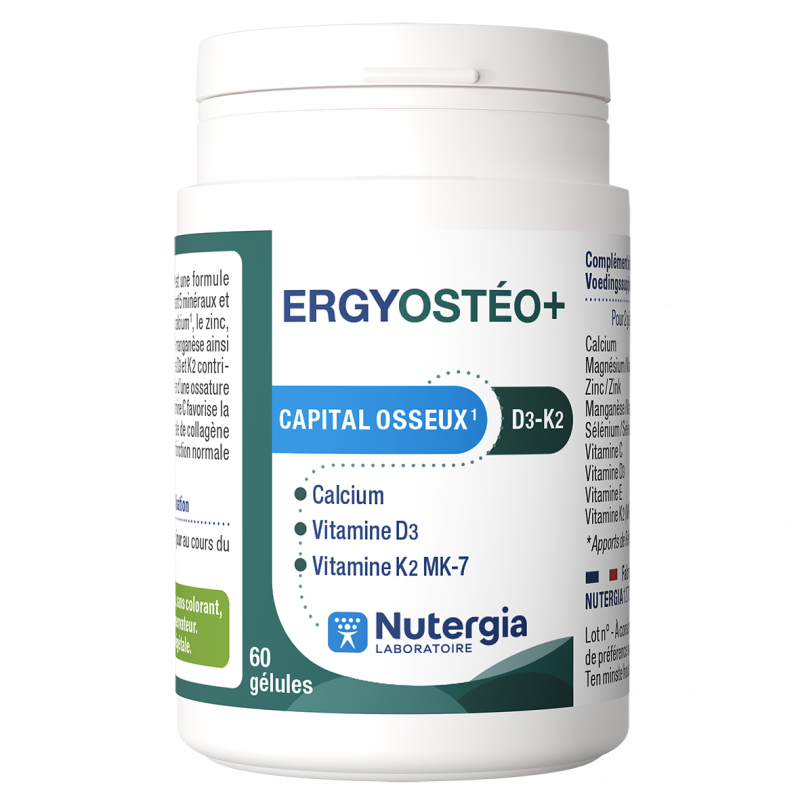ERGYOSTÉO+ est un complément alimentaire associant du calcium, de la vitamine D3 et de la vitamine K2 qui contribuent au maintien d’une ossature normale.