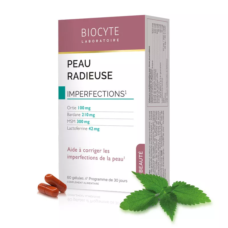 L’acné touche environ 6 millions de personnes en France dont 25% d’adultes(1). Notre alimentation actuelle, trop riche en graisses et en sucres, ainsi que les variations hormonales et le stress peuvent conduire à une production irrégulière de sébum faisant apparaître des imperfections cutanées. Biocyte Peau Radieuse est un complément alimentaire spécifiquement formulé pour limiter les imperfections cutanées. Il contient notamment de l'ortie qui contribue à une peau nette et aide les peaux à imperfections. Peau Radieuse est également formulé à base de lactoferrine, zinc, bugle rampant, MSM et bêta-glucanes qui contribuent à un beau grain de peau.