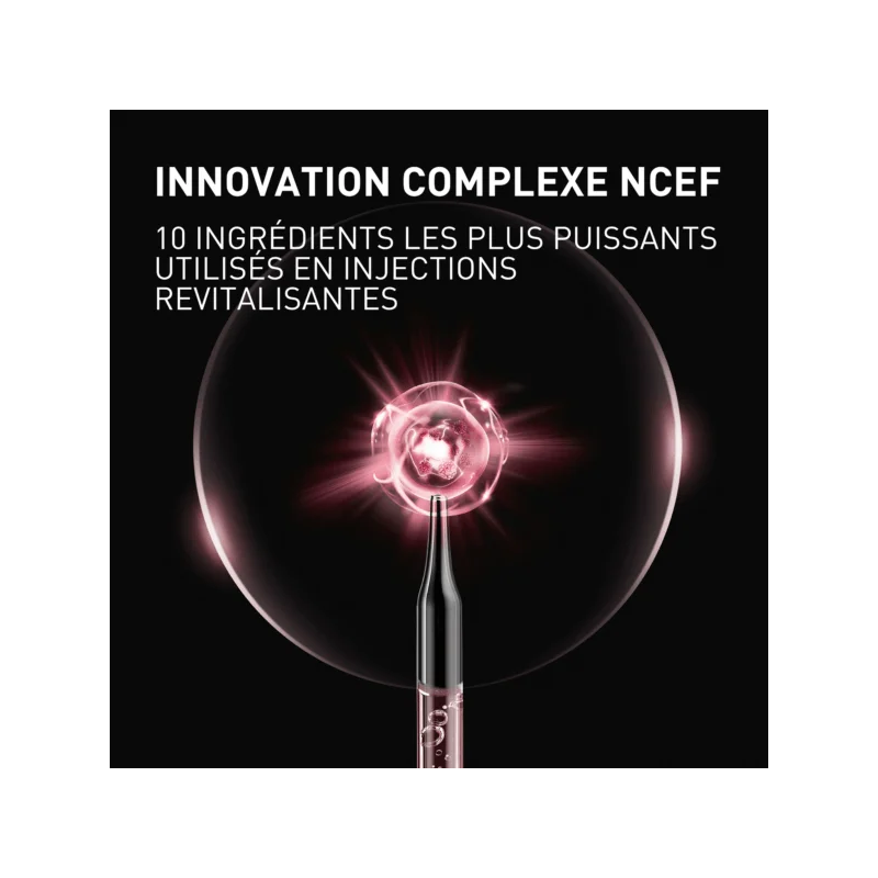 La formule de ce soin revitalisant est concentrée en NCEF, un complexe unique exclusivement développé par Filorga et inspiré des injections anti-âge régénératives. Il combine 10 ingrédients essentiels choisis avec précision (vitamines, acides aminés, co-enzymes…) pour améliorer la production de collagène et d’élastine mais aussi renforcer la protection antioxydante et la barrière cutanée. 5 tripeptides agissent simultanément pour redonner tonus et élasticité à la peau.