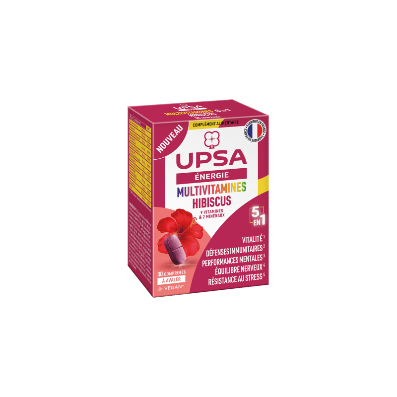Afin de vous aider à profiter au mieux de chaque journée, à faire face aux périodes intenses et aux changements de saison, le laboratoire UPSA a développé le complément alimentaire Multivitamines 5 en 1. Cette formule unique vous offre 5 bénéfices en un seul comprimé. Elle associe l’hibiscus, une plante aux propriétés stimulantes et énergisantes, à 9 vitamines et 2 minéraux, pour :