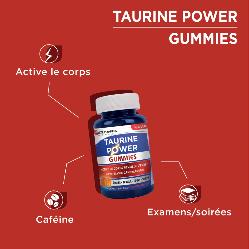 Pour les personnes en manque d’énergie et de peps à cause d’un rythme de vie effréné, conjuguant travail ou études, vie de famille, sport, sorties nocturnes, les Laboratoires Forté Pharma proposent Taurine Power en Gummies : un complément alimentaire à prendre ponctuellement n’importe où et à tout moment de la journée … ou de la nuit pour les noctambules !