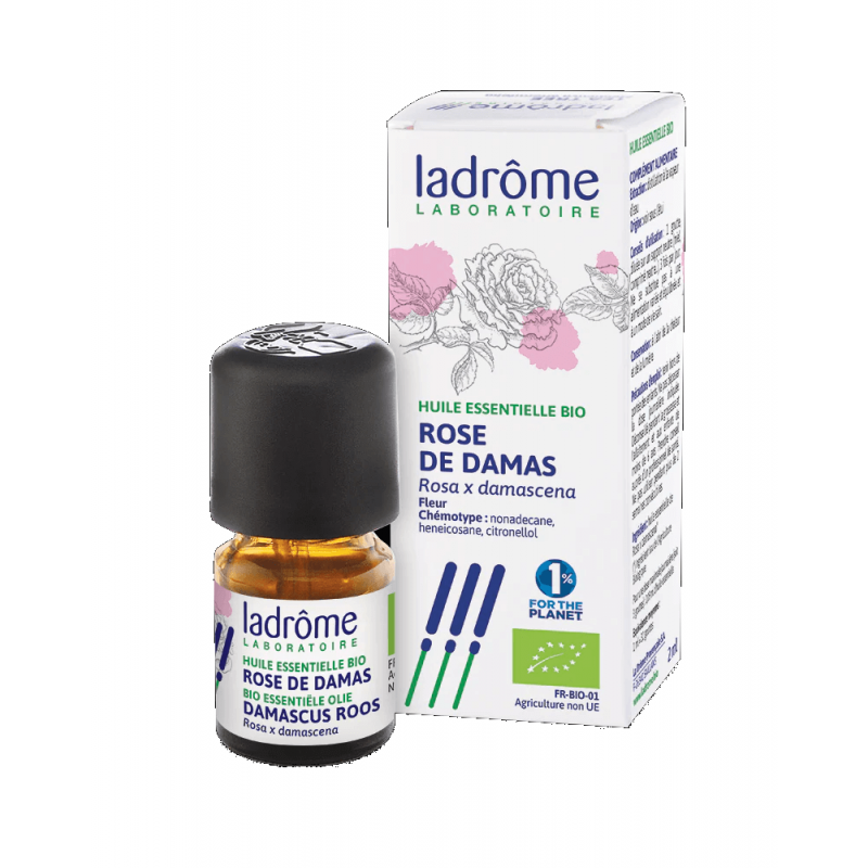 La Rose de Damas doit son nom à la capitale de la Syrie, mais c’est une variété de Rose qui trouve ses racines en Perse, l’Iran actuel. Les composants majoritaires de l’huile essentielle peuvent varier en fonction de l’origine de la plante. La Rose de Damas est un arbuste épineux (de 1 à 2 m) avec des fleurs rose foncé. La précieuse huile essentielle de Rose de Damas (aussi appelée : Otto de rose ou Attar de rose) possède un parfum intense, sucré et envoûtant. Elle doit être distinguée de l’eau de Rose et de l’extrait CO2 de Rose, moins chers, et de l’huile essentielle de Rosa centifolia (Rose du Maroc).