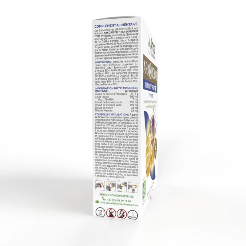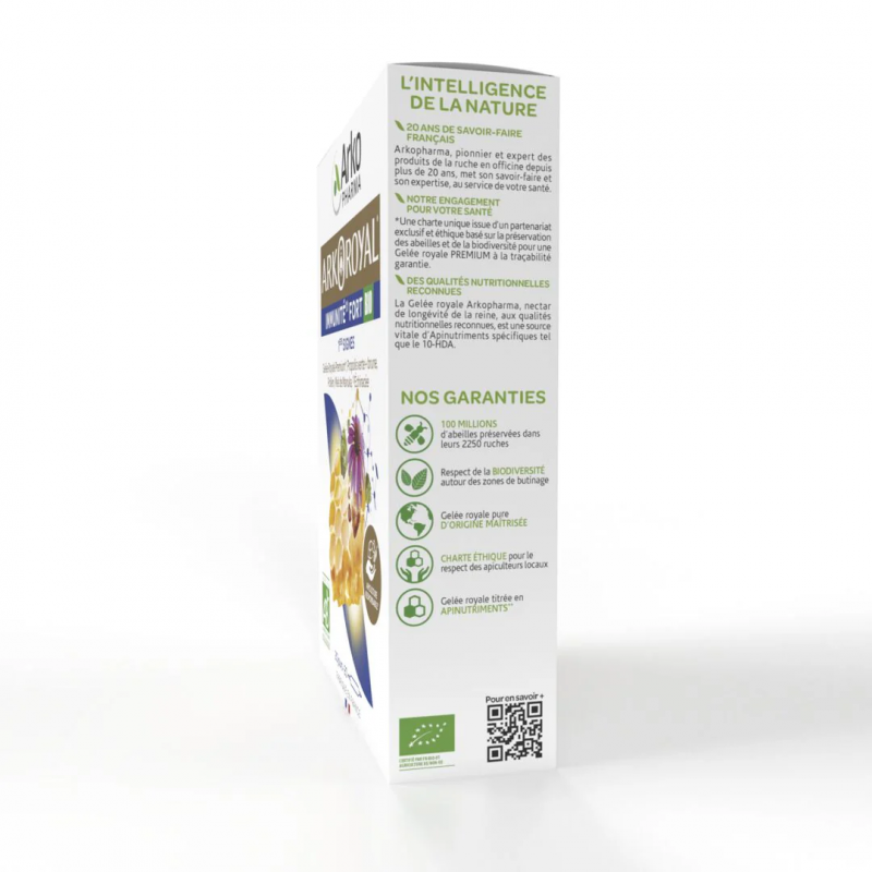 Arkoroyal® Immunité Fort BIO est formulé avec une gelée royale de qualité Premium, à la pureté préservée, et naturellement dosée à 2,5 % en Apalbumine-1.