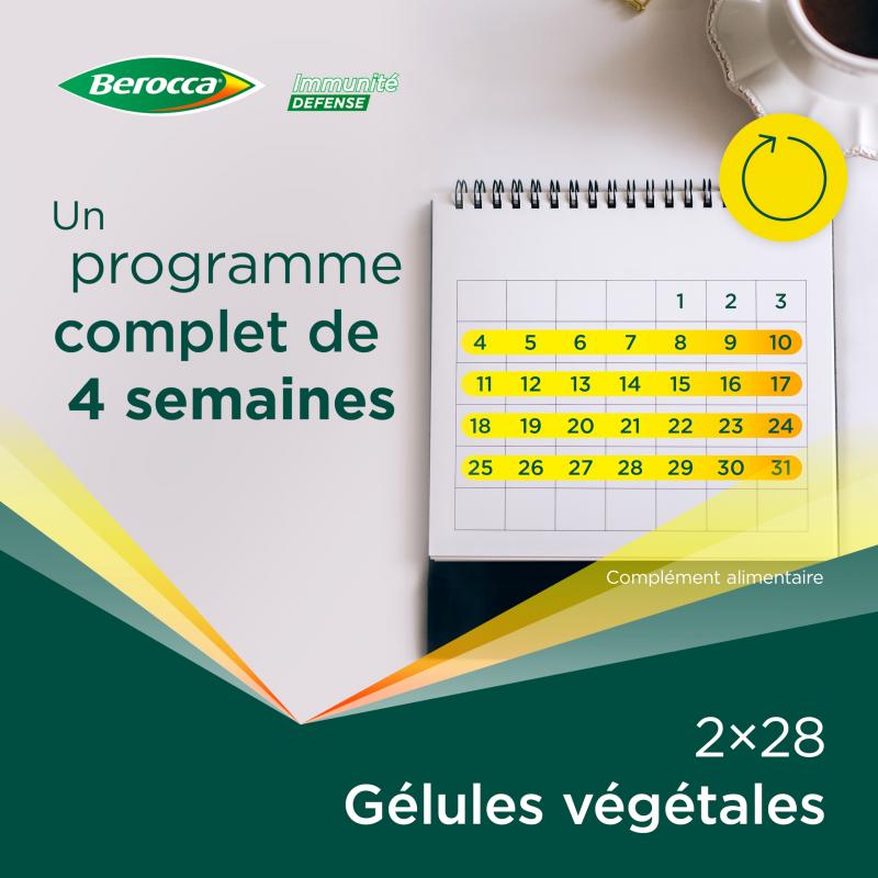 Berocca® Immunité Défense est un programme de 4 semaines renouvelable si besoin, en complément d’une alimentation variée et équilibrée et d’un mode de vie sain.