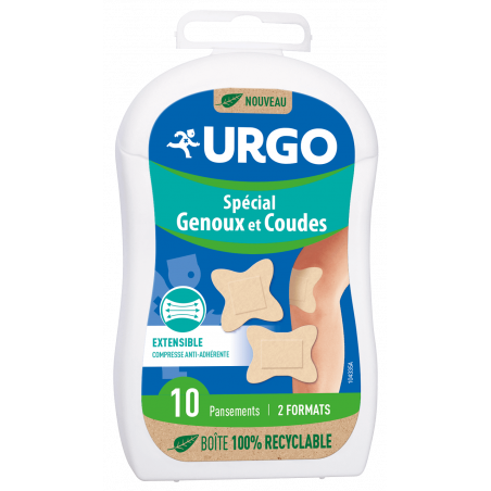 URGO Spécial Genoux et Coudes, pansements. Indication : protection des plaies superficielles. Ce dispositif médical est un produit de santé réglementé qui porte, au titre de cette réglementation, le marquage CE. Consultez les instructions sur l’étiquetage avant utilisation. Laboratoires URGO Healthcare. 09/2020