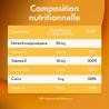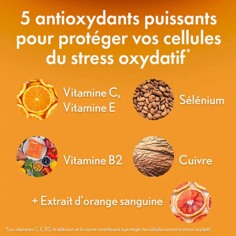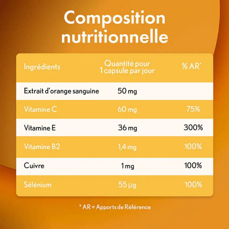 Extrait d’Orange Sanguine : 50 mg, Vitamine C : 60 mg | 75 %*, Vitamine E : 36 mg | 300 %*, Vitamine B2 : 1,4 mg | 100 %*, Cuivre : 1 mg | 100 %* , Sélénium : 55 µg | 100 %*