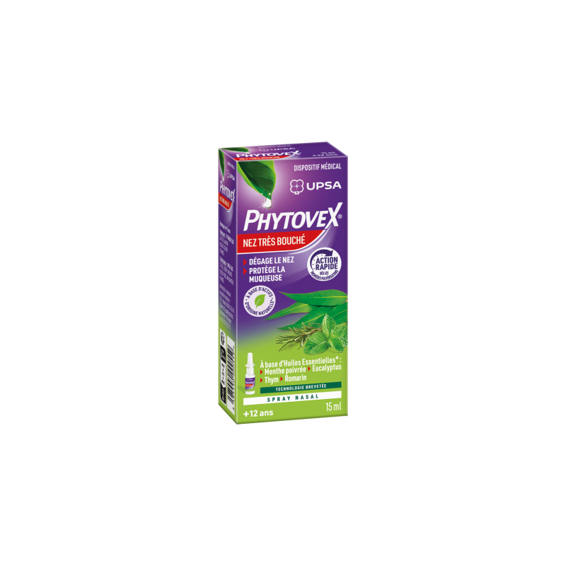 Phytovex Spray Nez Très Bouché de UPSA est un dispositif médical. Ce spray nasal décongestionnant et rafraîchissant est recommandé en cas d'encombrement nasal au moment d'une rhinite, d'un rhume ou encore d'une sinusite. Cette solution hypertonique vient dégager de façon naturelle les voies nasales afin de faciliter l'élimination des sécrétions nasales par drainage afin d'assurer au mieux un soulagement rapide et durable. Ce spray contient du glycérol d'origine végétale pour favoriser l'élimination des sécrétions nasales et afin de protéger les muqueuses des agressions et des huiles essentielles de menthe poivrée, eucalyptus, thym et romarin pour apporter une sensation de bien-être.