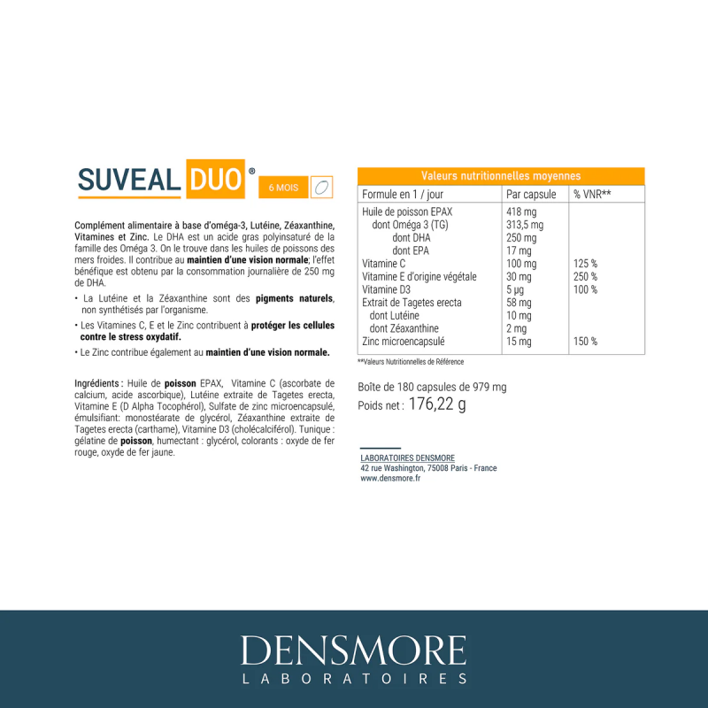 Huile de poisson EPAX, Vitamine C (ascorbate de calcium, acide ascorbique), Lutéine extraite de Tagetes erecta, Vitamine E (D Alpha Tocophérol), Sulfate de zinc microencapsulé, émulsifiant : monostéarate de glycérol, Zéaxanthine extraite de Tagetes erecta (carthame), Vitamine D3 (cholécalciférol). Tunique : gélatine de poisson à écailles et nageoires, humectant : glycérol, colorants : oxyde de fer rouge, oxyde de fer jaune. Ne contient pas de substances dangereuses.